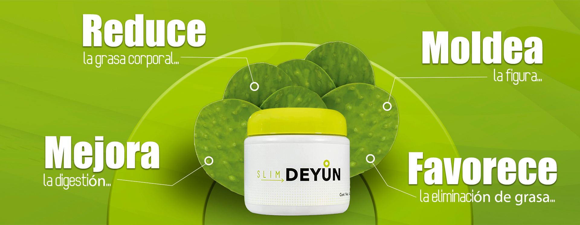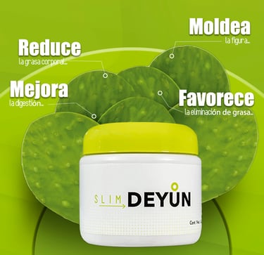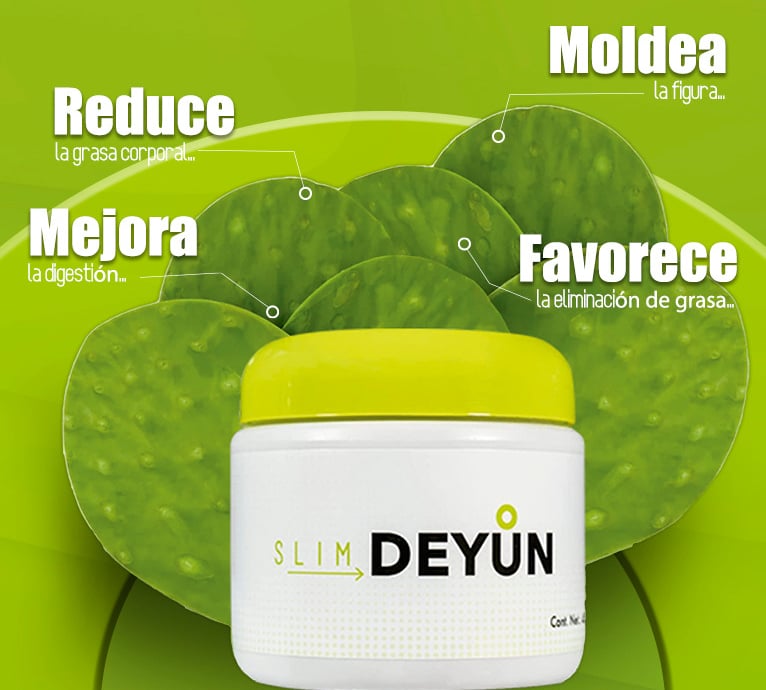 SLIM DEYUN, es un gel hecho a base de Nopal, Xoconostle, vitamina A, complejo B, C, minerales como el calcio, magnesio, sodio, potasio, potasio, hierro y fibras en lignina, celulosa, hemicelulosa, pectina, y mucílagos, en conjunto 17 aminoácidos que ayuda a reducir esas zonas de grasa no deseada y alcanzar los objetivos de figura de una manera saludable.